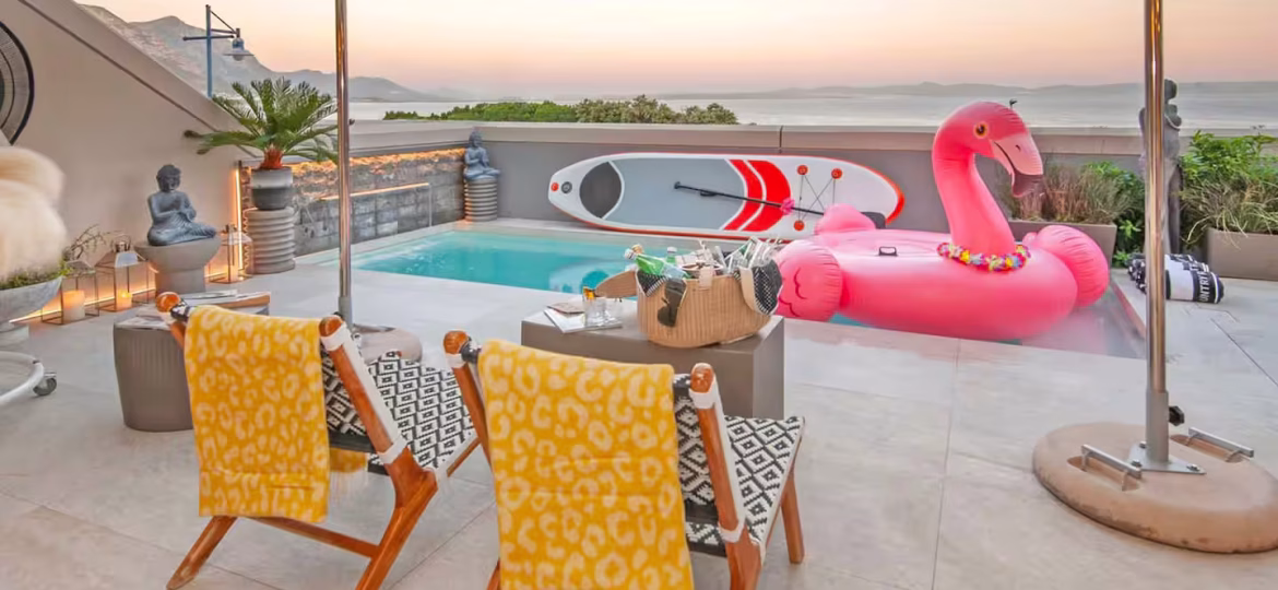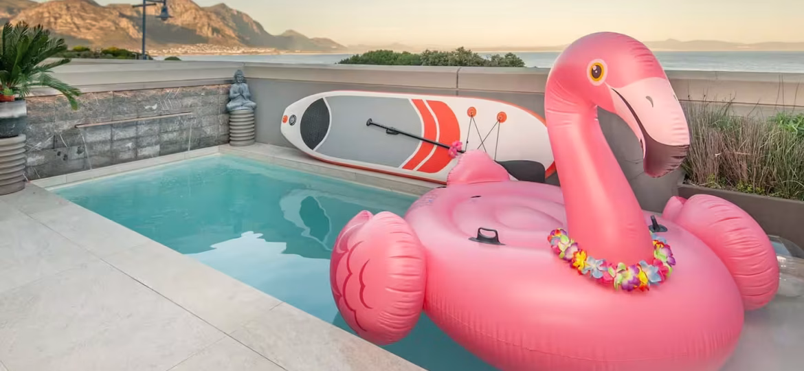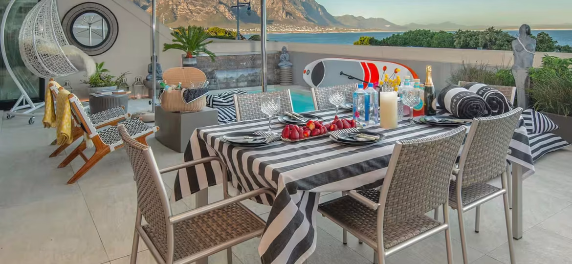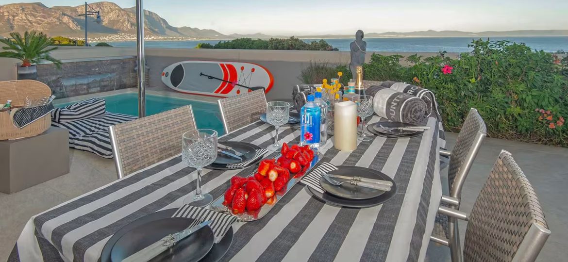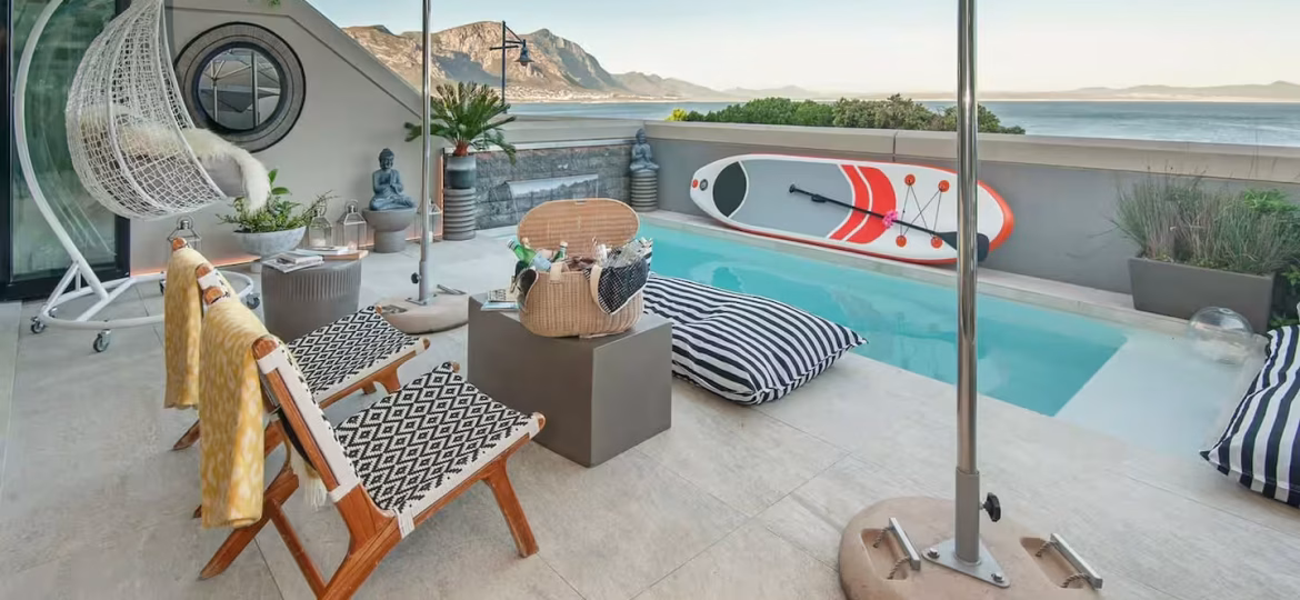 This apartment is surely one of it’s kind. Spectacular views, equipped with all the amenities and appliances that you could wish for to ensure a superb stay. Whales, galleries,restaurants & cliff paths on your doorstep. The lovely outdoor dining area with barbeque & pool is the perfect entertainment area to enjoy after exploring all Hermanus has to offer.